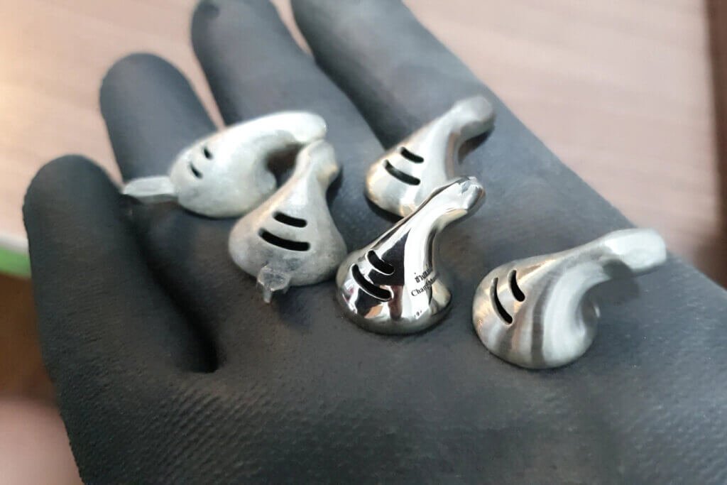 What’s unique about his earphones is the way he makes them — very much like a jeweler, using lost-wax metal casting. He designs each model in 3D, makes a reusable silicone mold, and casts wax shell prototypes from green jeweler’s wax. Those wax shells are then encased in a heat-resistant mold, the wax is burned out, and molten metal is poured in — creating perfectly matching metal shells. The real work starts after that: hours of cleanup, sanding, and polishing.