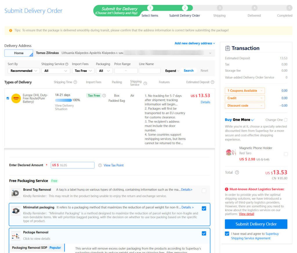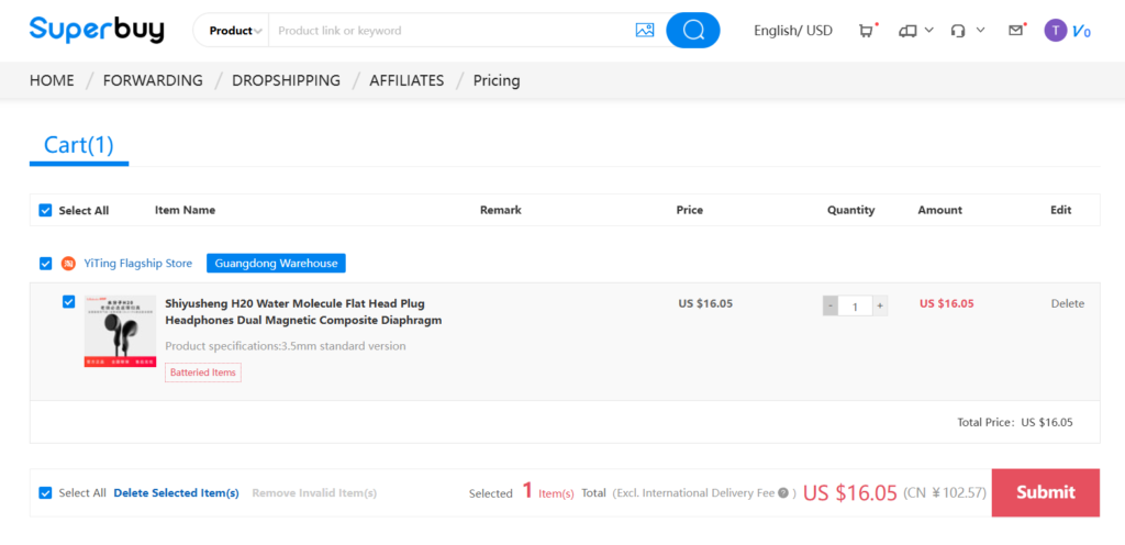 The Order confirmation page lets you choose some extra “value-added Services” which in most cases are not necessary, especially the packaging options, which you will be able to choose later when you order the international shipping. The only thing I would recommend choosis is the “Experience Small Amount Advance Payments Service” option visible above the “submit” button. This authorises SuperBuy to charge you small extra fees if needed to cover some price mismatches (sometimes they happen due to fluctuations in product prices or domestic shipping fees) without first informing you and then waiting for your manual payment.