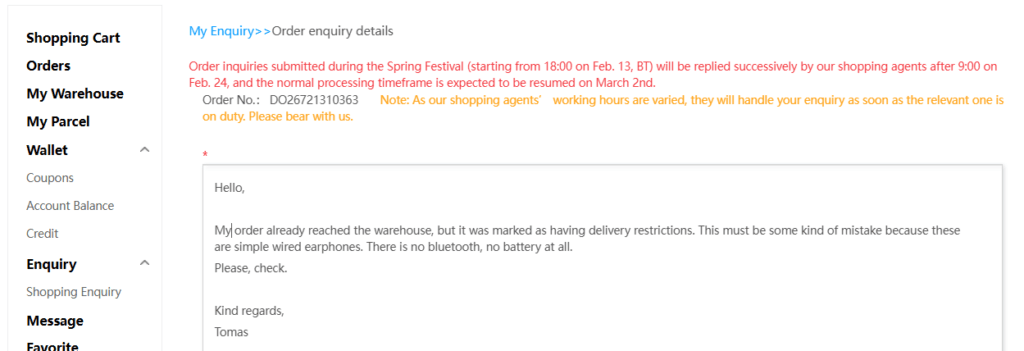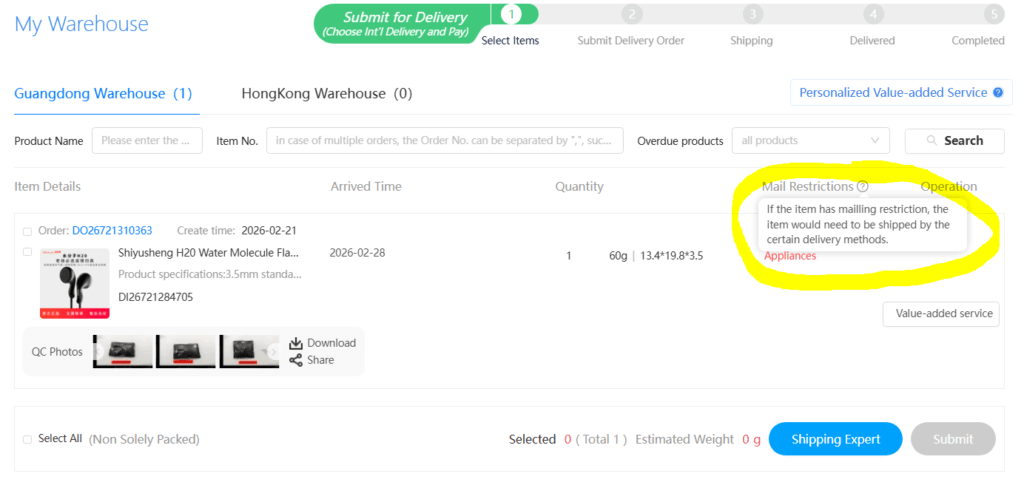 As you see, there are 3 thumbnail photos of the actual items received by the warehouse. Clicking on them opens larger photos. In case you notice something unexpected, you could contact the support. In my case, the photos did not show anything wrong but there was a remark “Appliances” show in red under “Mail Restrictions” section – I circled it in yellow for you to see. Placing the mouse pointer over the question mark, revealed the message “If the item has mailling restriction, the item would need to be shipped by the certain delivery methods”. That’s not good. We don’t want this as this limits the shipping methods, probably eliminating the cheapest ones. This may happen for battery-powered devices but there’s no reason for simple wired earphones, so I’ll try to contact the support to resolve this issue.